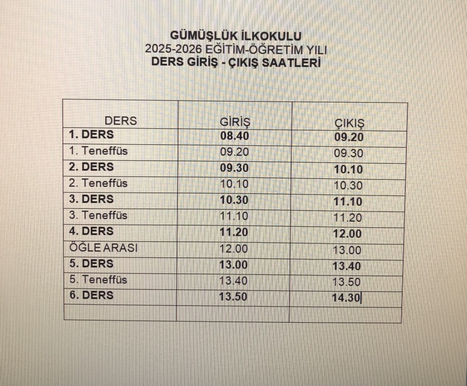 2025-2026 eğitim öğretim yılında uygulanacak olan ders giriş çıkış saatlerimiz